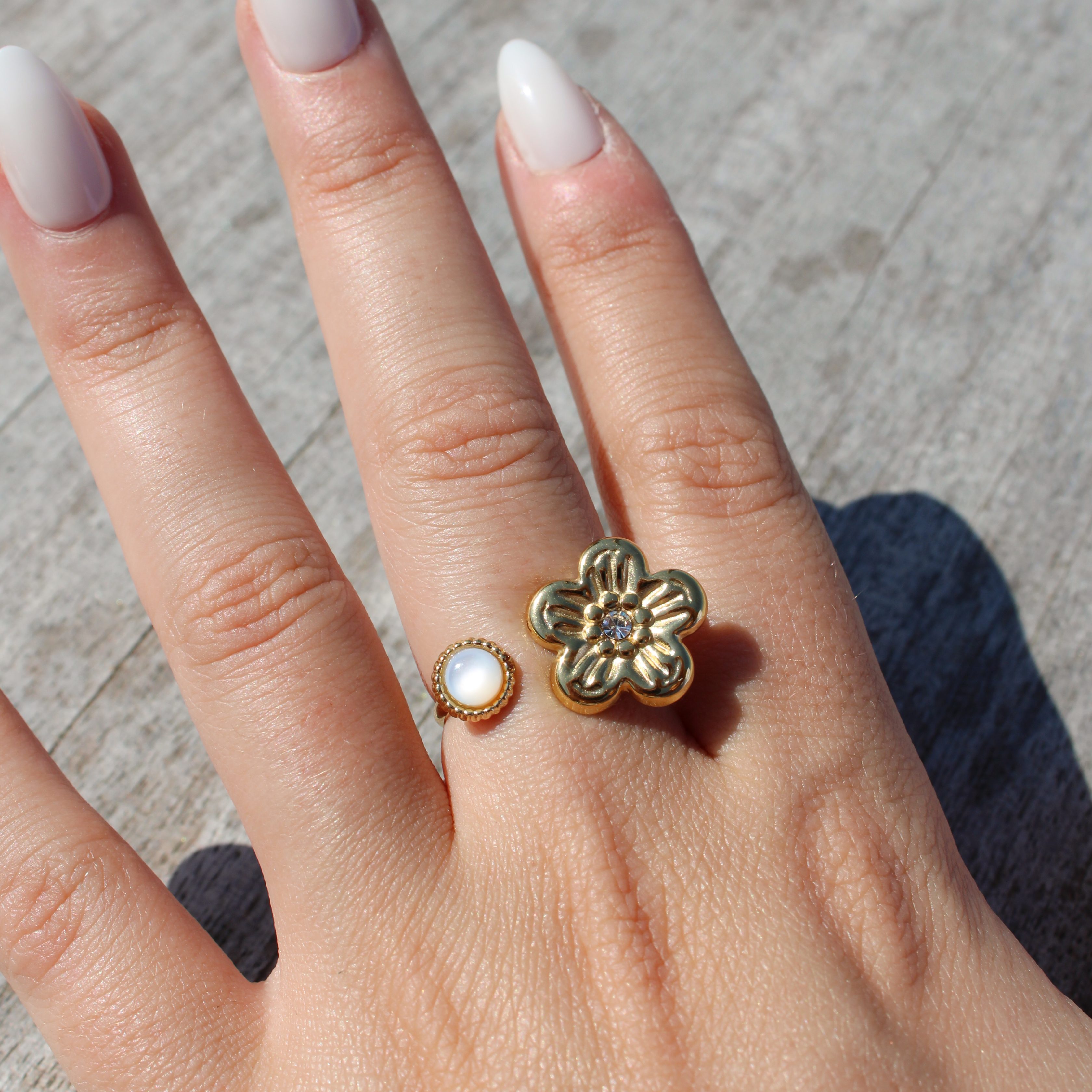 • Type de design : bague ouverte pierre et fleur