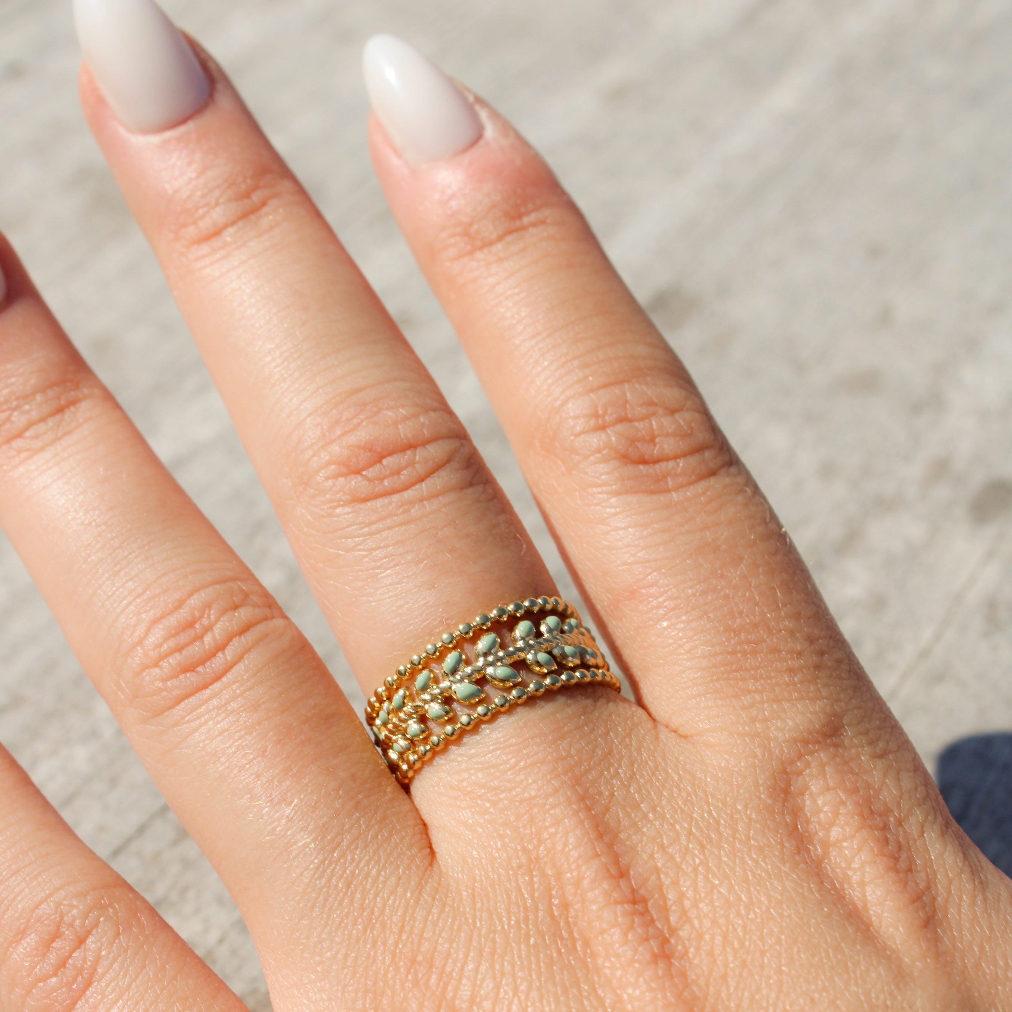 La bague Viorica verte en acier inoxydable est une pièce qui allie modernité et classe! Avec son design original, elle sera parfaite pour rehausser n’importe quelle tenue avec une touche de doré.