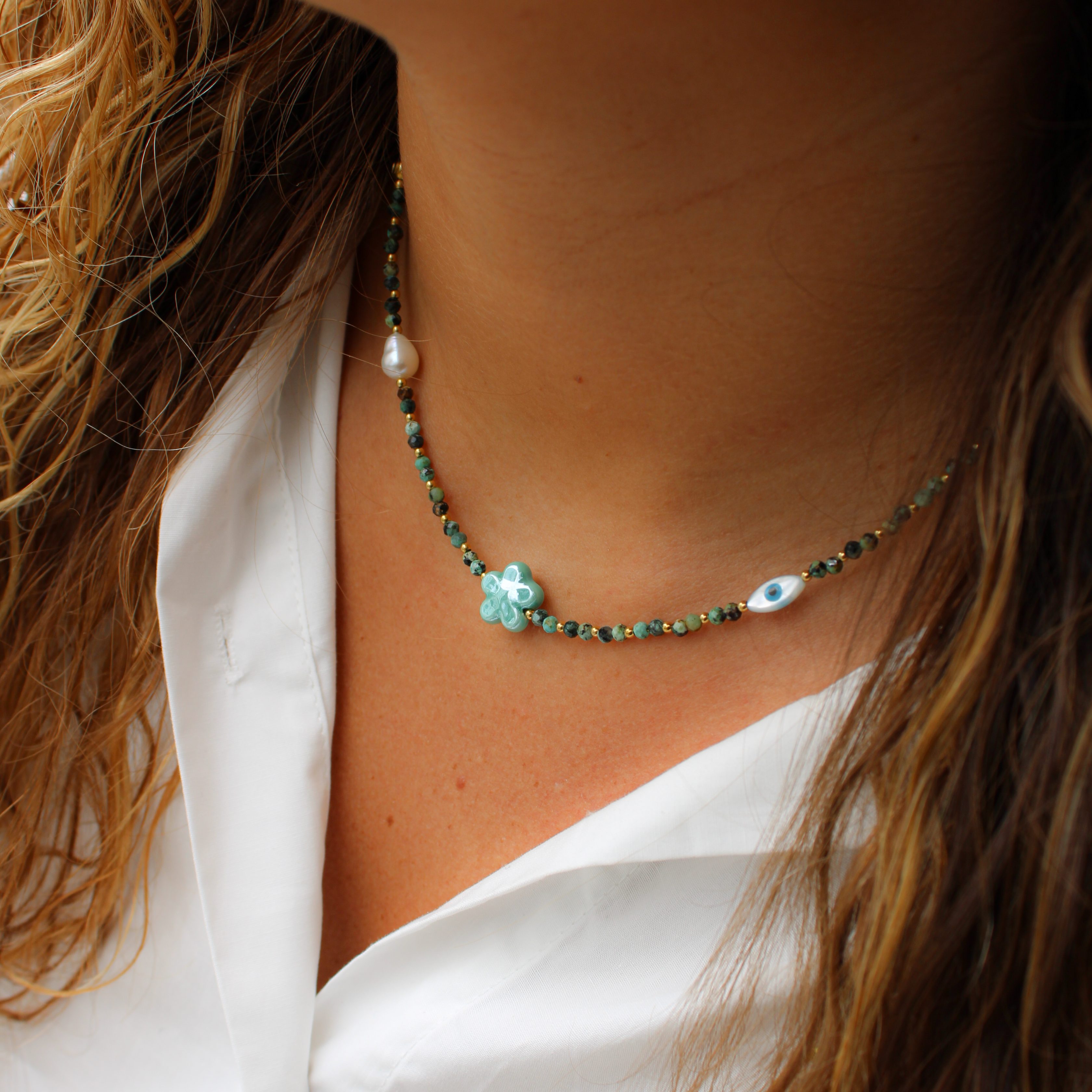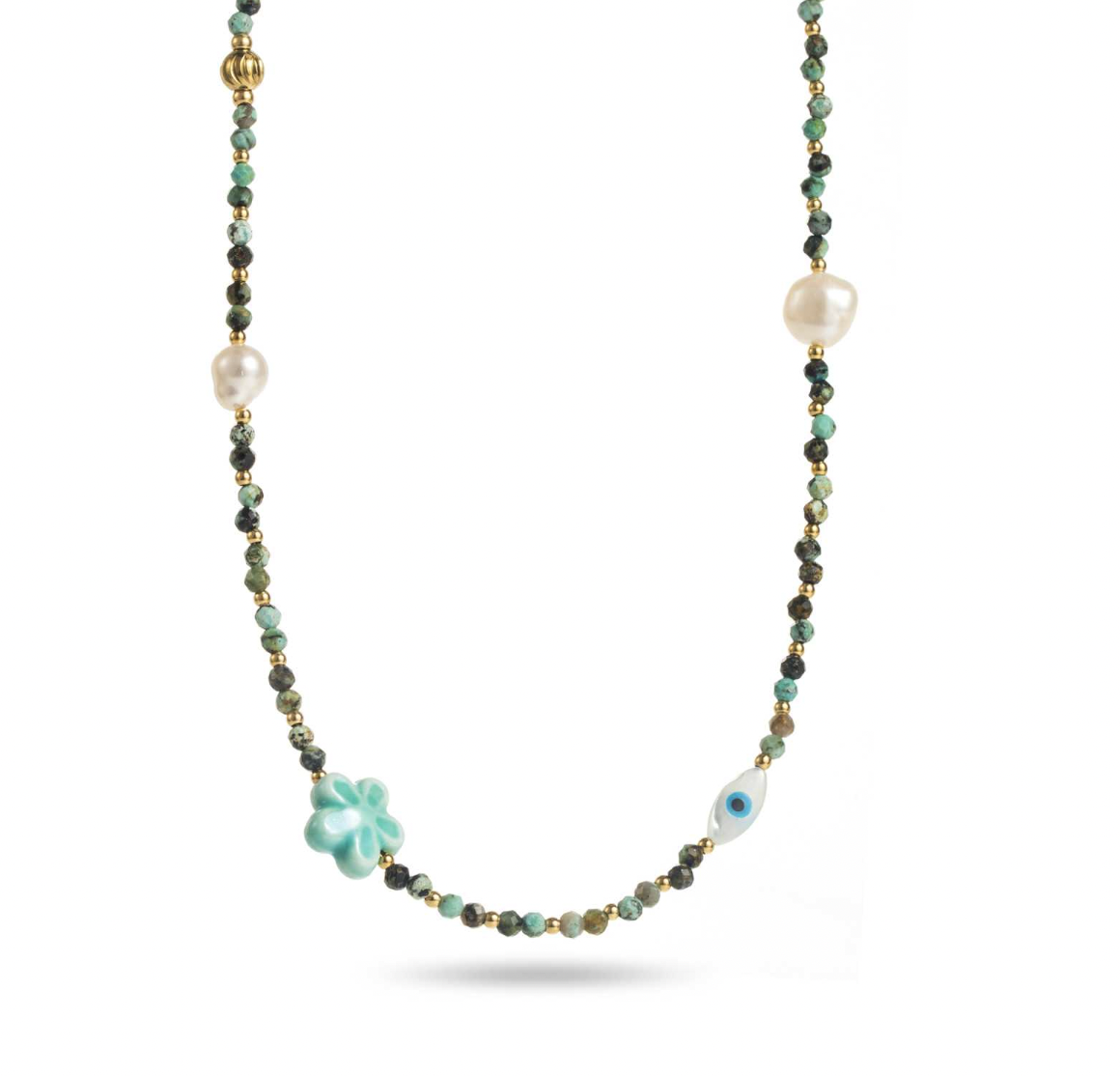 Avec ses perles et son esprit solaire, le collier Lotu turquoise est l’accessoire parfait pour sublimer vos tenues estivales. À la fois discret et plein de caractère, il apporte cette petite touche de style qui évoque les vacances, la peau dorée et les journées ensoleillées.