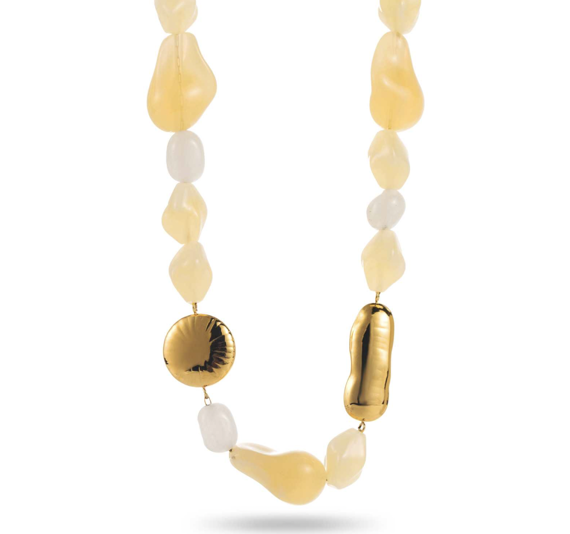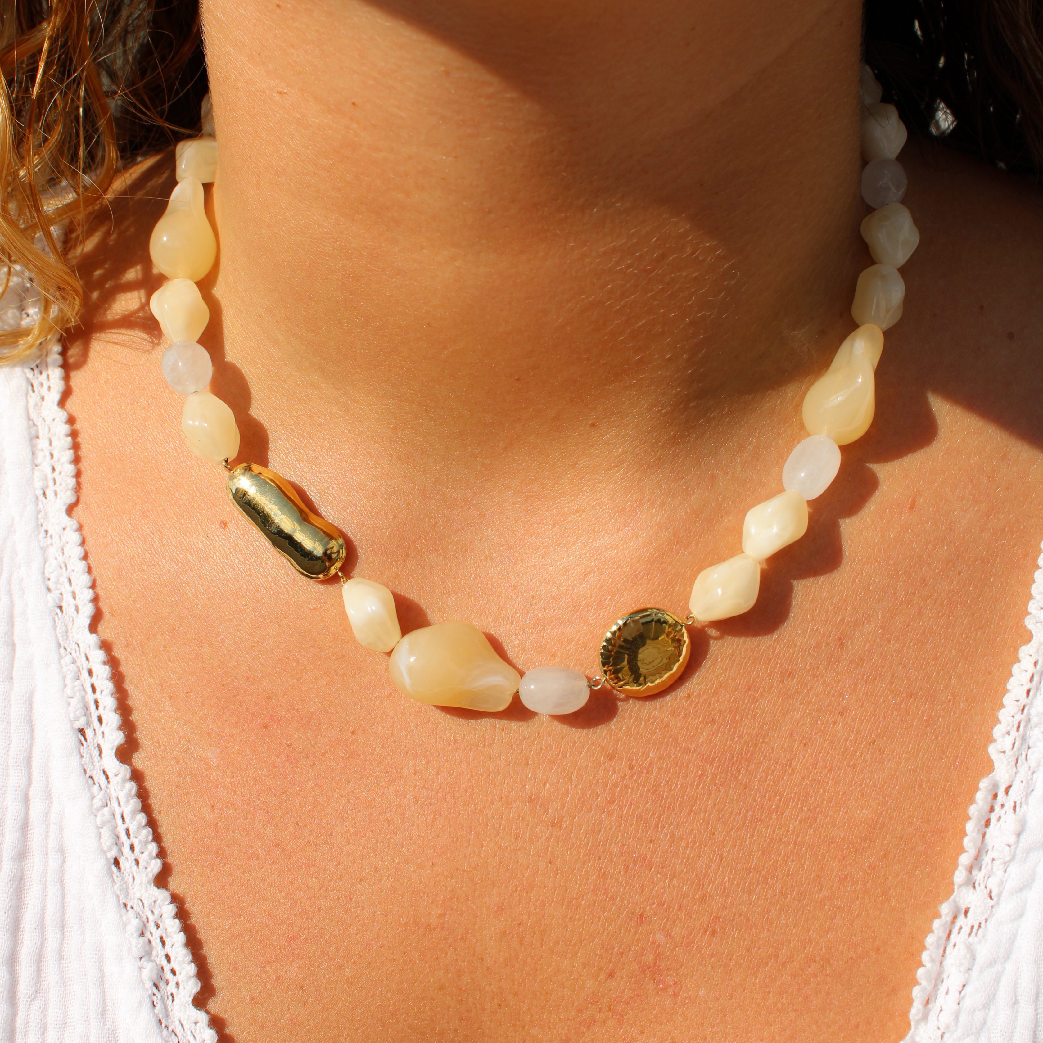 Le Collier Oro Miel célèbre la douceur du doré et la lumière du miel. Composé de perles aux formes organiques, mêlant tons nacrés et dorés, il capture l’éclat du soleil avec une élégance naturelle. Ses perles dorées au fini brillant apportent une touche moderne à ce bijou au charme solaire.