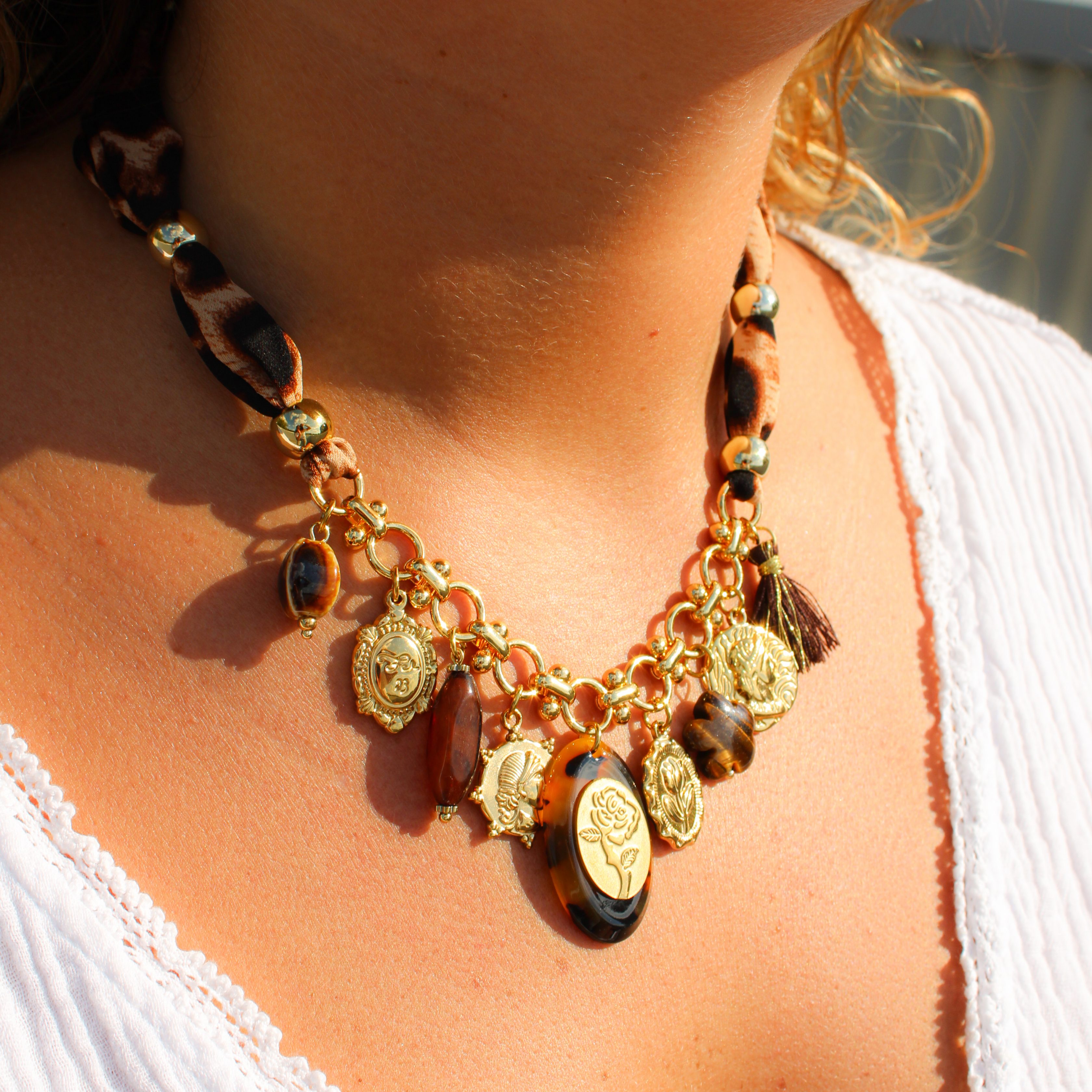Laissez-vous séduire par le charme solaire du Collier Sol de Toscana, un bijou à l’allure bohème chic et au caractère affirmé. Ses perles aux tons chauds – bruns, ambrés et dorés – s’accordent harmonieusement avec un ruban à imprimé sauvage. Les médaillons dorés finement gravés rappellent les bijoux anciens, symboles de force et de féminité.