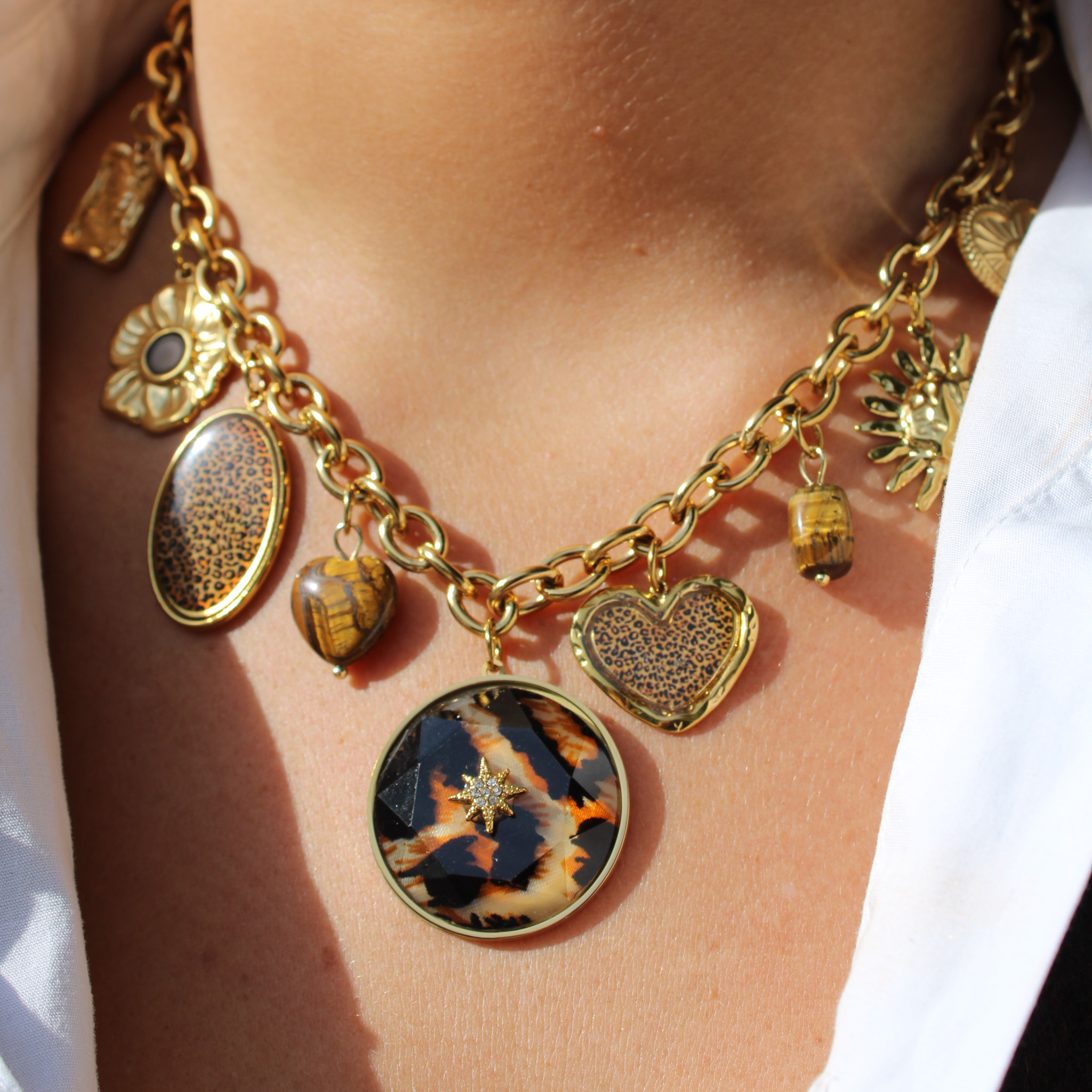 Le Collier Sol Dorado incarne la force et l’éclat du soleil. Ses breloques dorées et ses médaillons aux motifs félins apportent une touche sauvage et sophistiquée. Le grand pendentif central, orné de nuances brunes et dorées, capte la lumière à chaque mouvement pour illuminer votre décolleté.